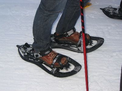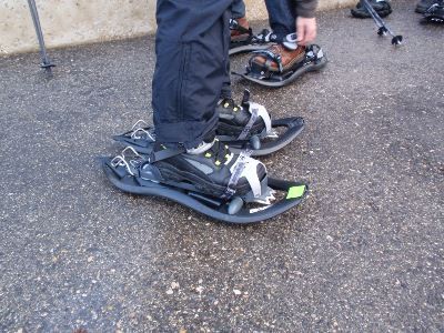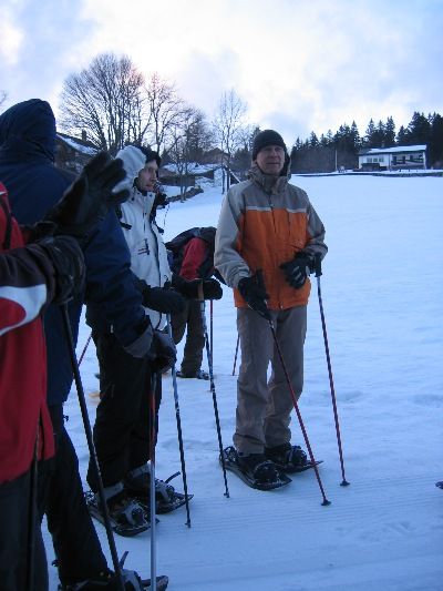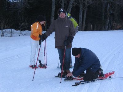 Nachdem die Schneeschuhe gefasst wurden, gibt's schon Probleme beim anschnallen. Für etwas haben wir ja einen Guide...